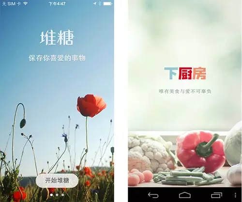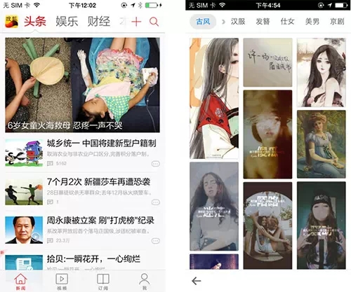下面的左圖是一個新聞app,采用豎向分欄的布局,模塊化的結構使得信息的展現整潔和嚴謹。右圖是一個圖片展示app,則采用了三欄的布局,把圖片以這種瀑布流的形式展現給用戶,方便用戶快速瀏覽。但是由于平級的信息,很難區分主次,而人的視線很難在同一時間聚焦在兩個或者兩個以上的事物上,所以通過圖片錯路排列,使得畫面更為活潑。