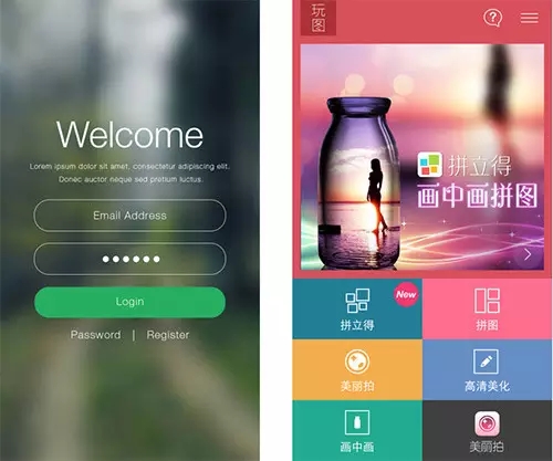 下面的左圖是一個注冊頁面,btn采用了中軸型的構圖,清晰地展現了操作項和注冊流程。右圖采用了上下分割的版面構成,上面為圖片展示,下面部分為選項和操作,結構非常清晰。