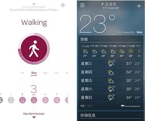 下面的兩個圖例雖然都以信息的展示為主,但因界面的信息量、app的功能特性因素的影響,左圖的運動記錄界面信息量比較上,采用了中軸型布局,而右圖的天氣app信息量比較大,采用了滿版型布局。合理的布局選擇對于信息的展示有至關重要的作用。