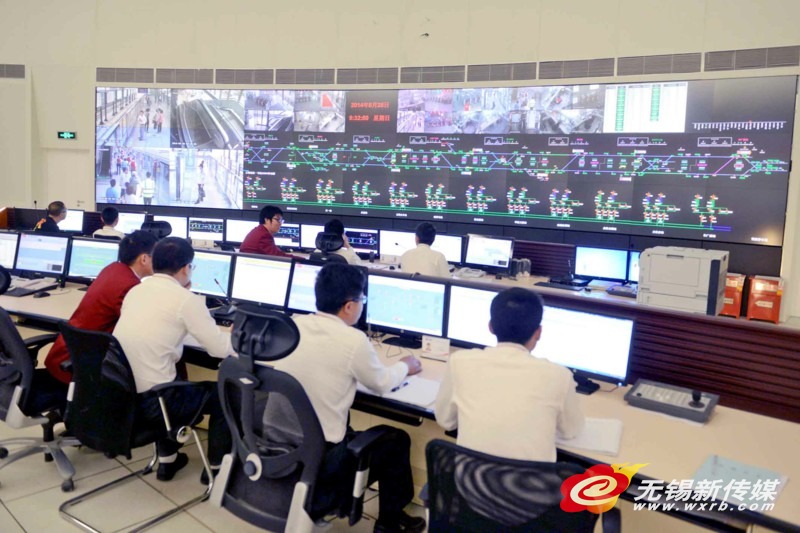 相關負責人介紹,大屏幕最上方一個個顯示著列車、車站景象的小窗口是1號線各個站點的實時監控圖像,可以清晰看見地鐵內發生的情況。下面有著紫色綠色條紋的一幅幅圖像就是地鐵的信號系統,哪輛車行到哪里,間隔多少,是否有情況需要停車……這里一目了然,調度人員就是在同步的電腦屏幕上進行調度,保證地鐵正常運營。最下面的是供電系統,停電、變電、送電等操作都在這上面完成。