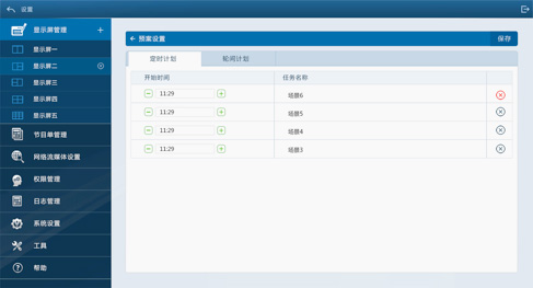 針對應用場景和特殊場景,可以進行不同的預案,設定不同主題的屏幕內容和屏幕切換顯示的時間。