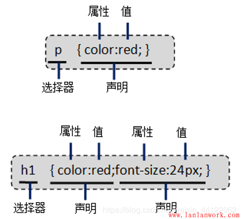選擇器{ 屬性1: 值; 屬性2: 值; …