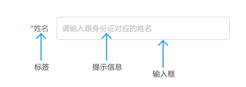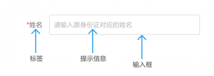 一個(gè)輸入框,通常有標(biāo)簽名稱label、提示信息placeholder(輸入信息后提示文字消失)、初始值value(需手動(dòng)刪除)。如果是必填表單,在適當(dāng)位置(標(biāo)簽的前后,輸入框后)加上紅色*號(hào)(或其他符號(hào))