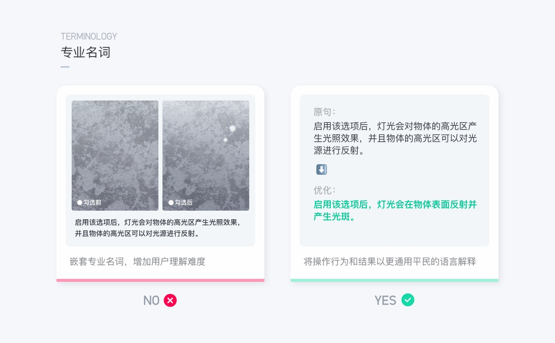 專業名詞:結合善解人意和直率原則,避免讓用戶產生多重疑惑,專業名稱平民化、通用化