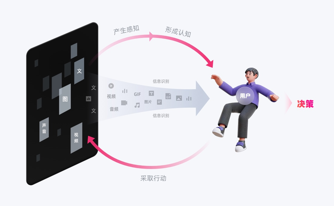 信息識別,可簡單理解為:感知到(看到/聽到)信息,并能夠理解它。本質是在用戶與界面交互中,會經歷「感知信息→認知信息→做出決策與行動」的歷程,從感知到認知,是信息獲取和辨識理解的過程,即「信息識別」。