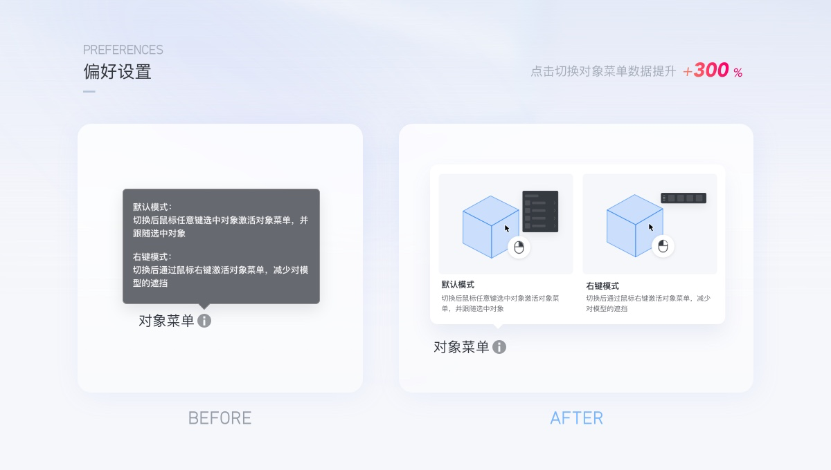 案例3:對象菜單鼠標偏好設置在設計工具中,選擇對象喚出菜單,在酷家樂工具中可以設置為鼠標左鍵點擊即喚出菜單(僅展示圖標),也可以鼠標右鍵喚出菜單(圖標文字結合)。