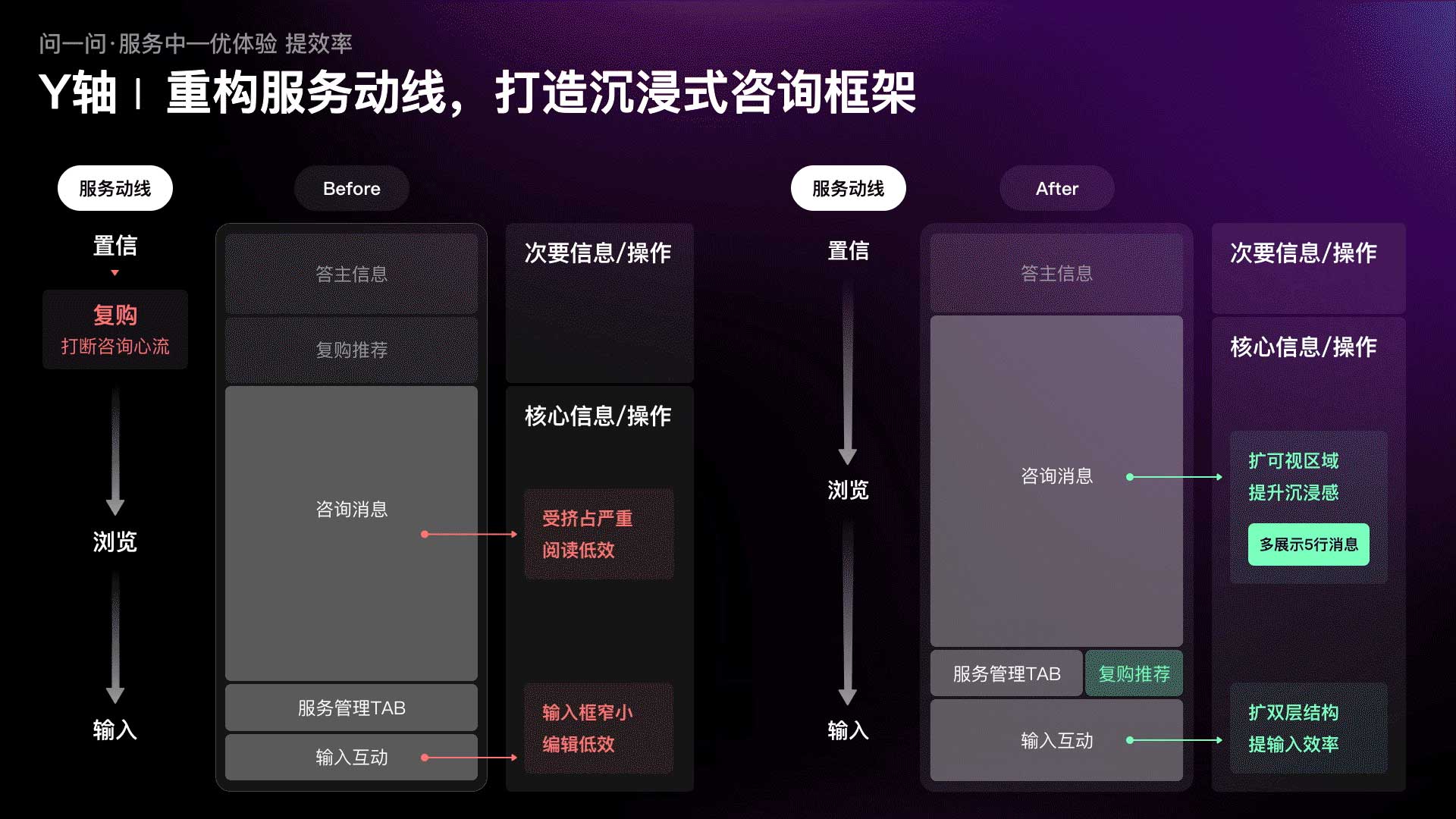 ?到了新的發展階段,我們的設計愿景該如何實現?問一問設計團隊以“服務體驗”為原點,發起了C端核心服務體驗的升級專項。借助用戶觀察、體驗遍歷等方法,沿用戶真實體驗路徑梳理服務“前-中-后”各階段的關鍵問題、挖掘優化機會。再結合設計、體驗雙視角,建立以服務前“建認知、促轉化”、服務中“優體驗、提效率”、服務后“增觸達、助留存”為核心指導原則的設計打法。通過切實滿足用戶在服務各階段需求來激發持續消費、讓服務閉環順暢運轉,從而有效地賦能業務增長,達到體驗和收入的雙豐收。