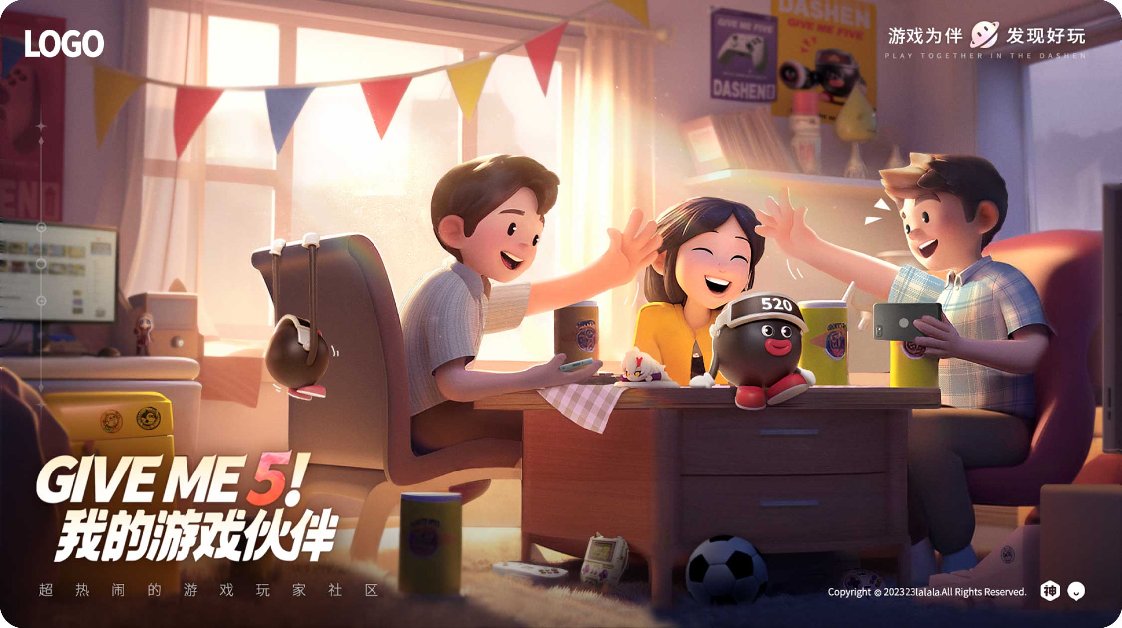 需求方希望畫面能展現出品牌的社交感,以“游戲伙伴”為主題,畫面表達各種不同類型游戲伙伴,因我們的產品而相聚的場景。同時希望畫面中的人物能做出擊掌(GIVE ME 5)的動作,以此呼應品牌發布會的主題。