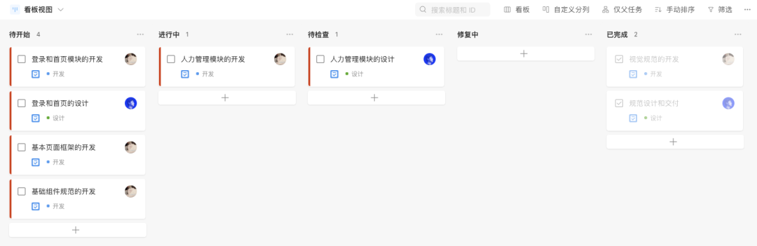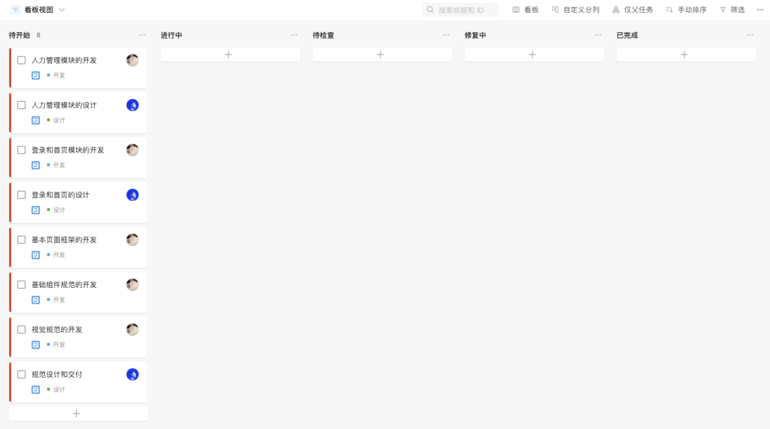 在看板工具中創建待開始、進行中、待檢查、修復中、已完成5個步驟,然后開始在待開始內創建相關的任務卡片。