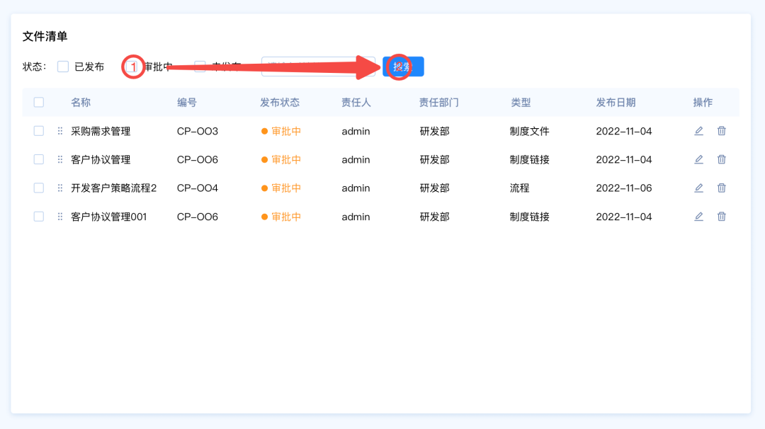 需求背景:客戶A想要快速篩選文件清單中發布狀態為“審批中”的數據,希望能夠直接看到文件的狀態類型,快速選擇類型。