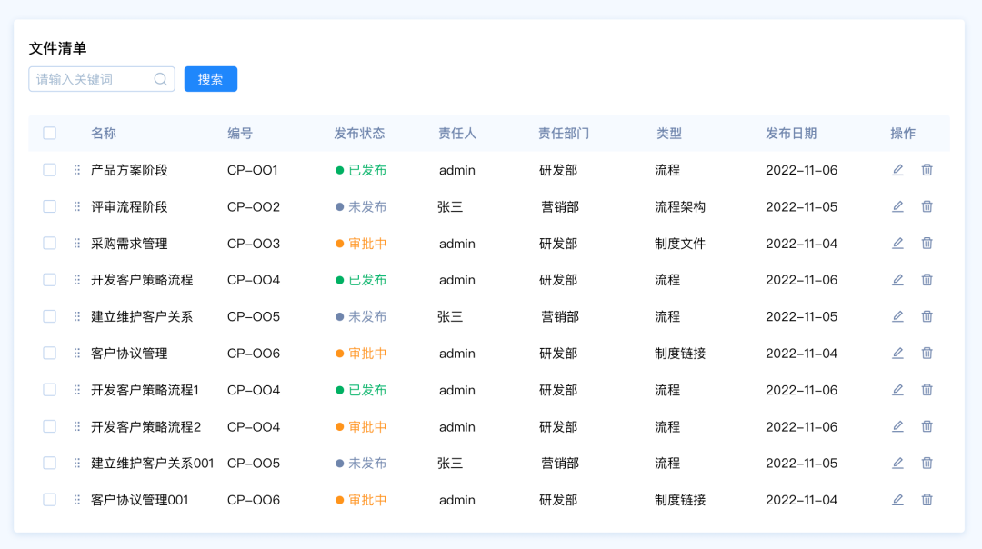設計要點:由于這里包含多種篩選類型,名稱和編號是關鍵詞篩選,發布狀態和、責任人、責任部門、類型是選項篩選,發布日期是時間區間篩選。所以我們需要采用組合篩選的模式。