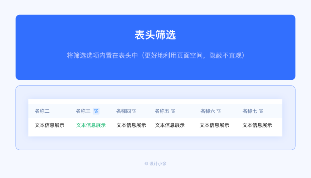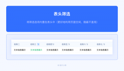 將篩選選項內置在表頭中(更好地利用頁面空間,隱蔽不直觀)。當頁面空間有限時,可以考慮此方案。另外當表格表頭字段數據較多時,需要橫向滑動查看數據時,建議還是直接將篩選條件單獨放在外面?;蛘弋斝枰Y選的選項太多時,表頭字段都能篩選時,也可以考慮放在表頭中。