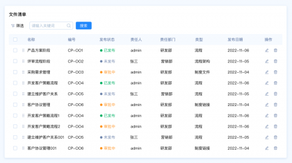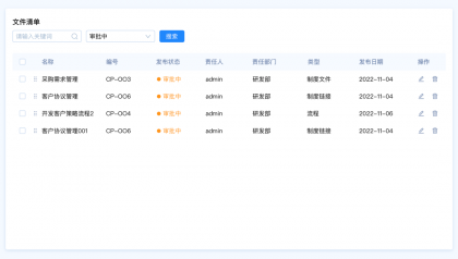 設計要點:客戶需要根據文件清單的狀態快速篩選數據,文件的狀態一共分為三類:已發布、審批中、未發布,雖然客戶只說需要篩選審批中的數據,但是另外兩個狀態的數據也同樣有篩選的場景,所以我們直接將狀態類型作為選項,客戶使用時只需要選擇狀態類型即可快速完成篩選。