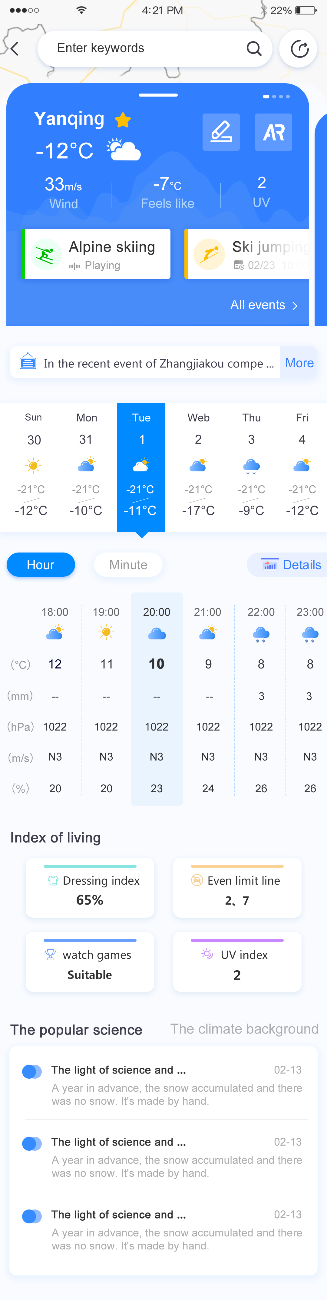 天氣綜述模塊,天氣綜述只要是展示近段時內總體的一個天氣情況,可以給將要來參賽或者觀賽人員的一個友好告知,做好相對應的準備。