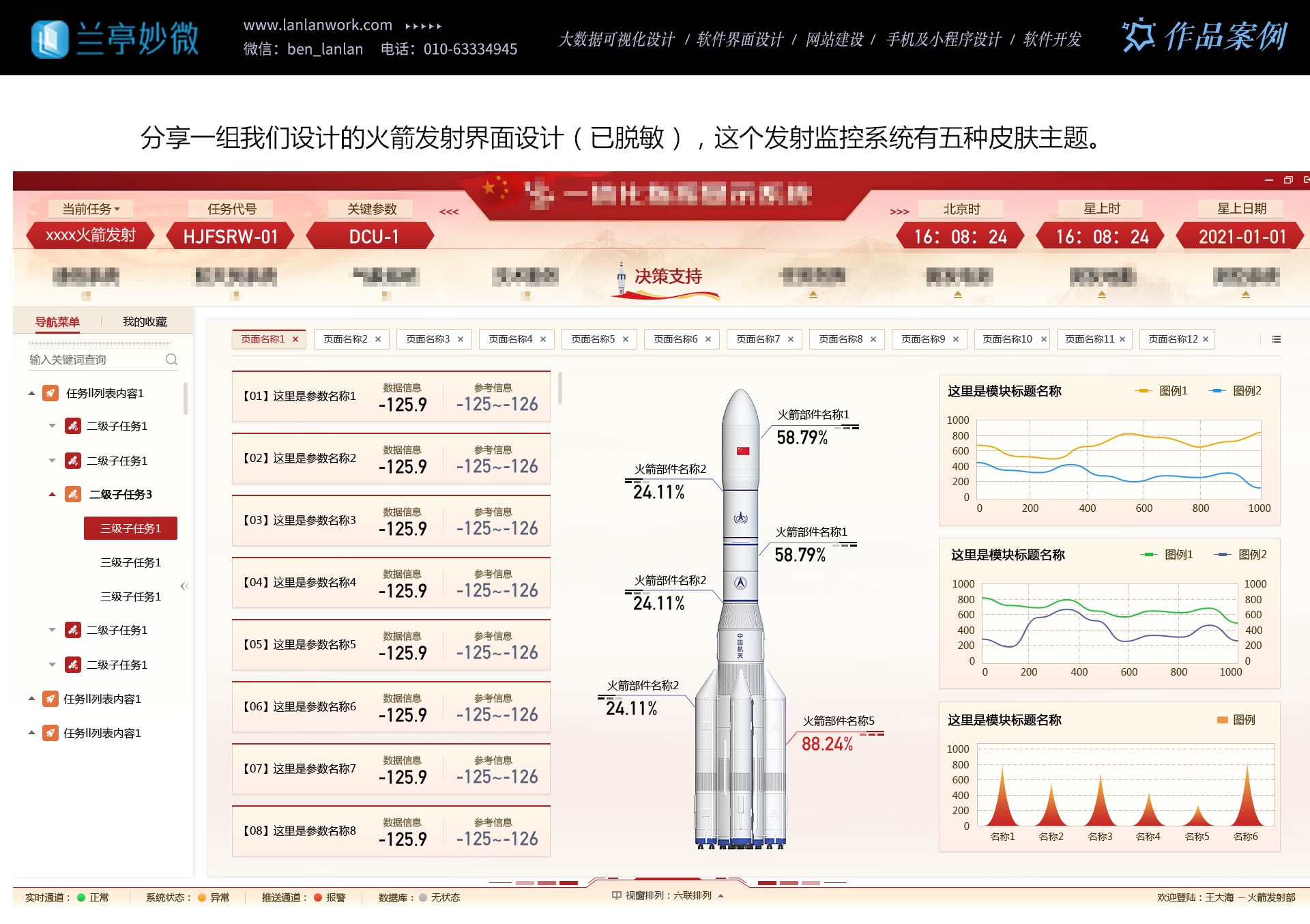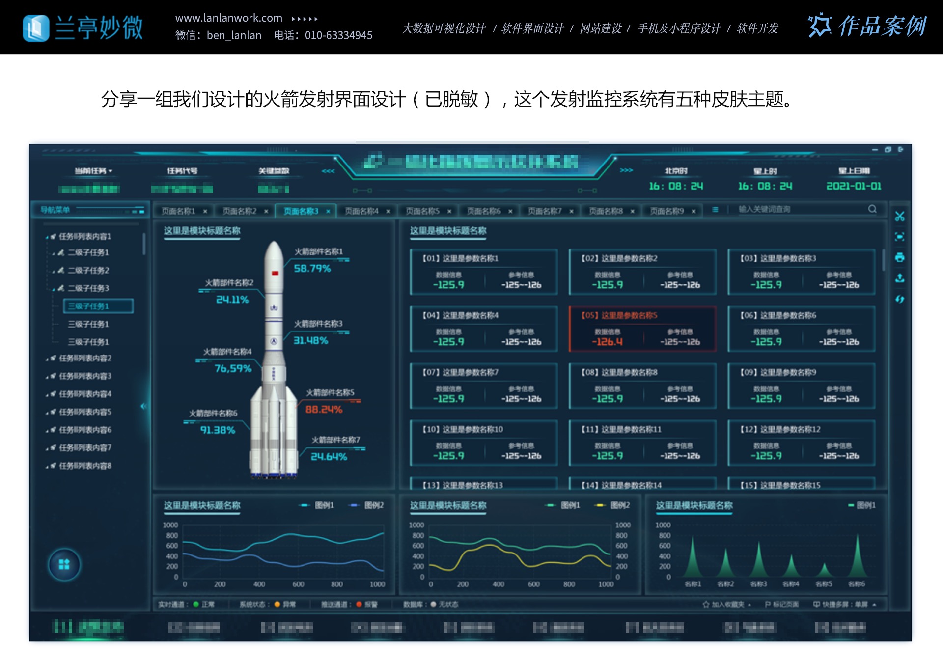 多年來,蘭亭妙微與航天四院、二院、三院、九院、中國電子等緊密合作,完成了多個重點項目。他們的設計成功助力企業增強了品牌形象,提升了競爭力,提高了工作效率與產品滿意度,降低了培訓成本,增強了安全性。選擇蘭亭妙微,就是選擇航天軍工領域最專業、最可靠的 UI 設計合作伙伴。讓我們攜手共創卓越未來,為航天軍工事業的發展貢獻力量。