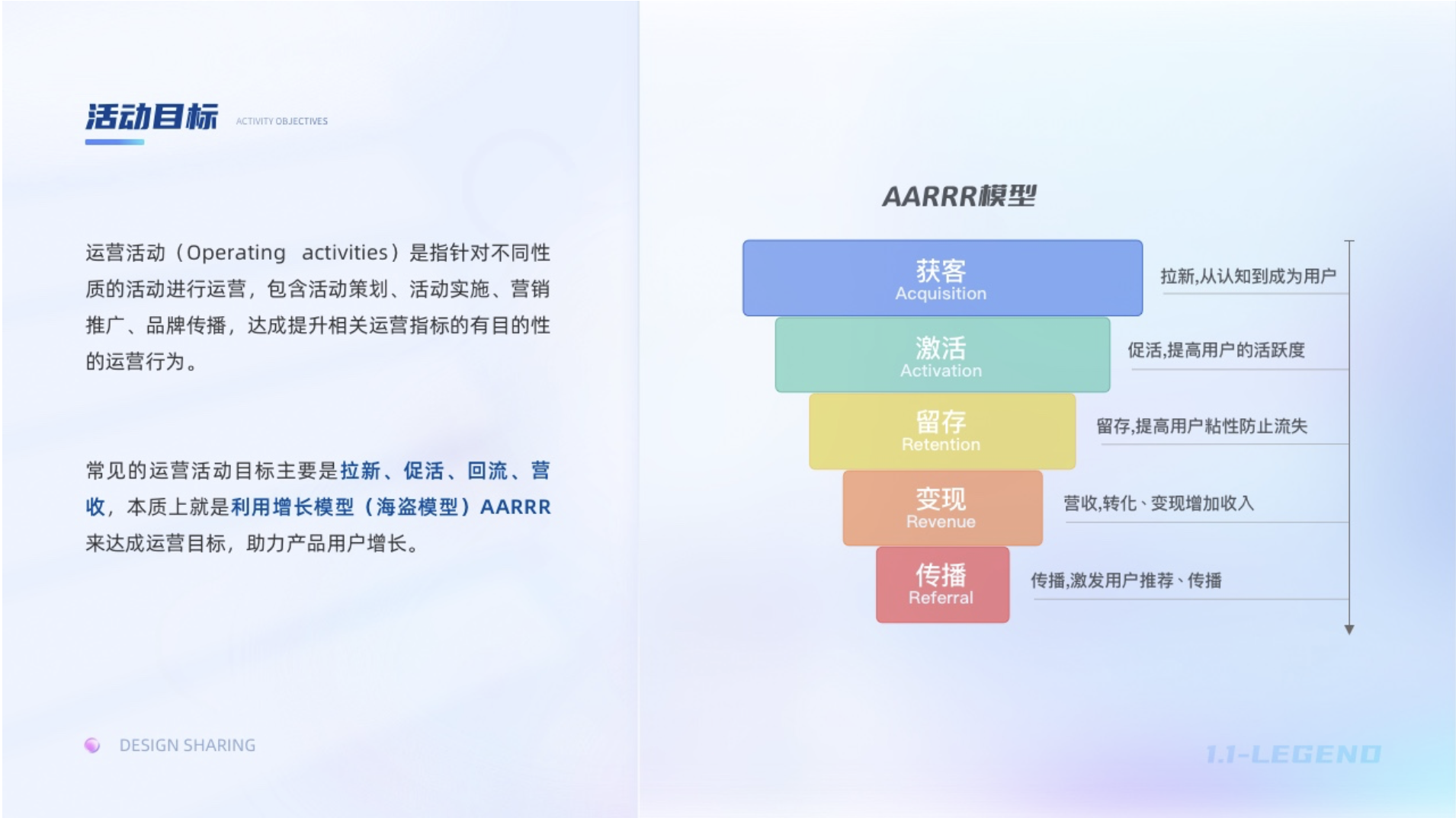 運營活動(Operating activities)是指針對不同性質的活動進行運營,包含活動策劃、活動實施、營銷推廣、品牌傳播,達成提升相關運營指標的有目的的運營行為。為了更好的達成既定目標,項目立項后我們需要了解此次運營活動的目標,以目標展開設計策略和設計實施。常見的運營活動目標主要是拉新、促活、回流、營收,本質上就是利用增長模型AARRR來達成運營目標,助力產品用戶增長。