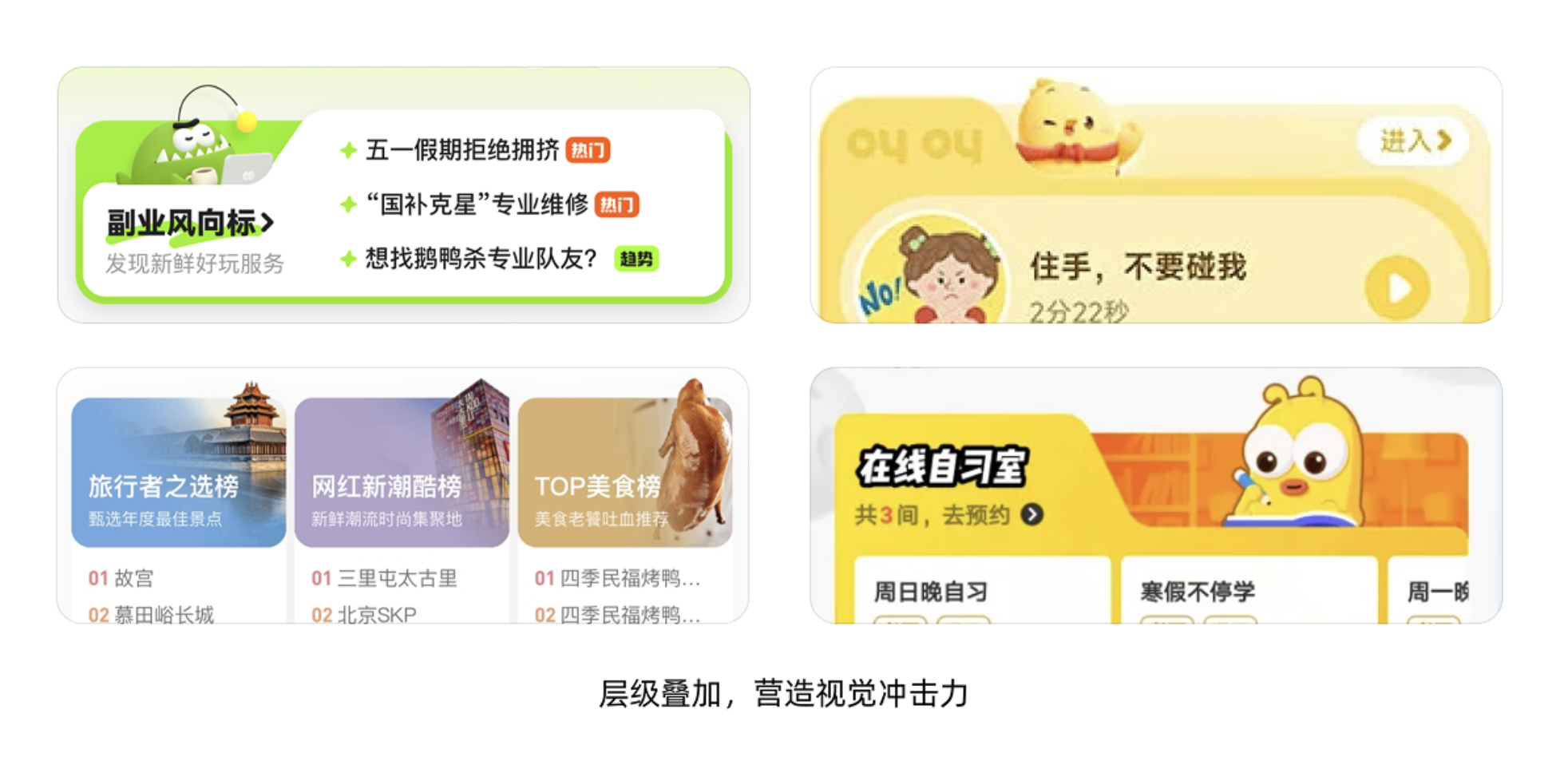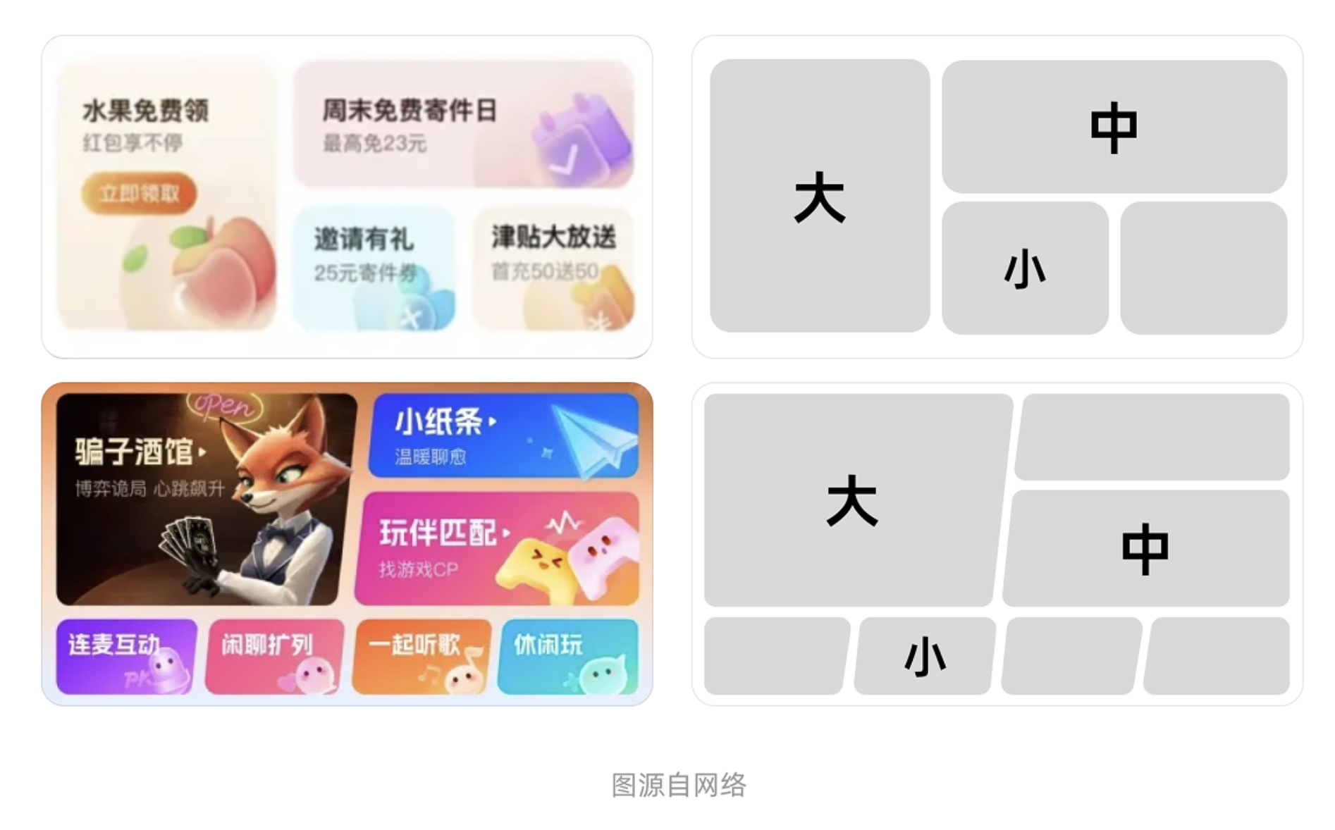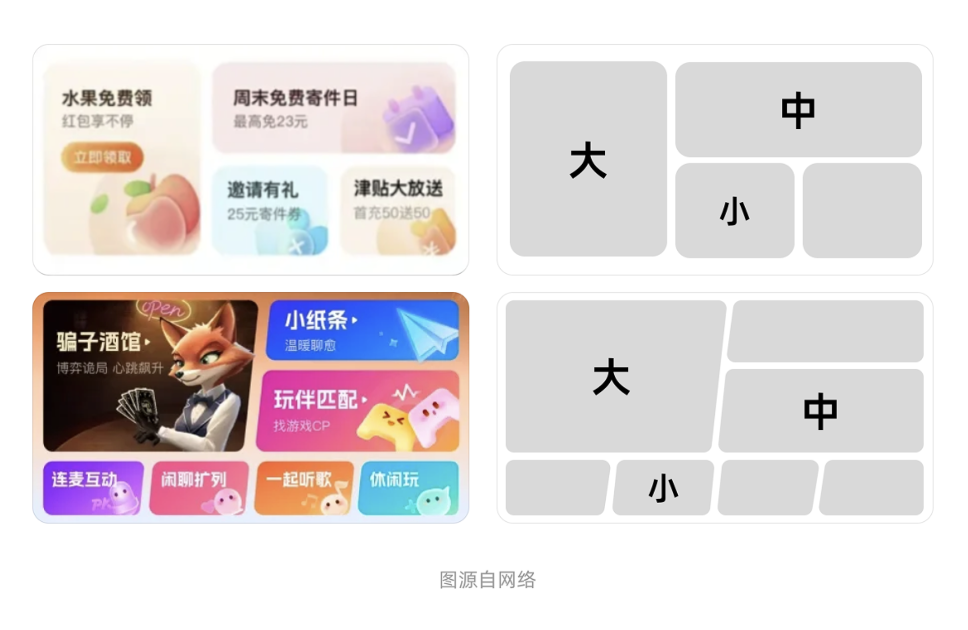1、我們可以根據瓷片區數量靈活排版,選取1-2個核心功能放大展示,讓模塊形成“大-中-小”有節奏感的布局: