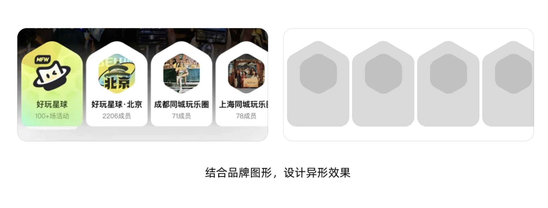 除以上兩種形式外,我們還可以結合品牌圖形,在卡片上延續品牌基因,例如馬蜂窩的社區卡片,就用蜂窩的六邊形作為卡片的形狀: