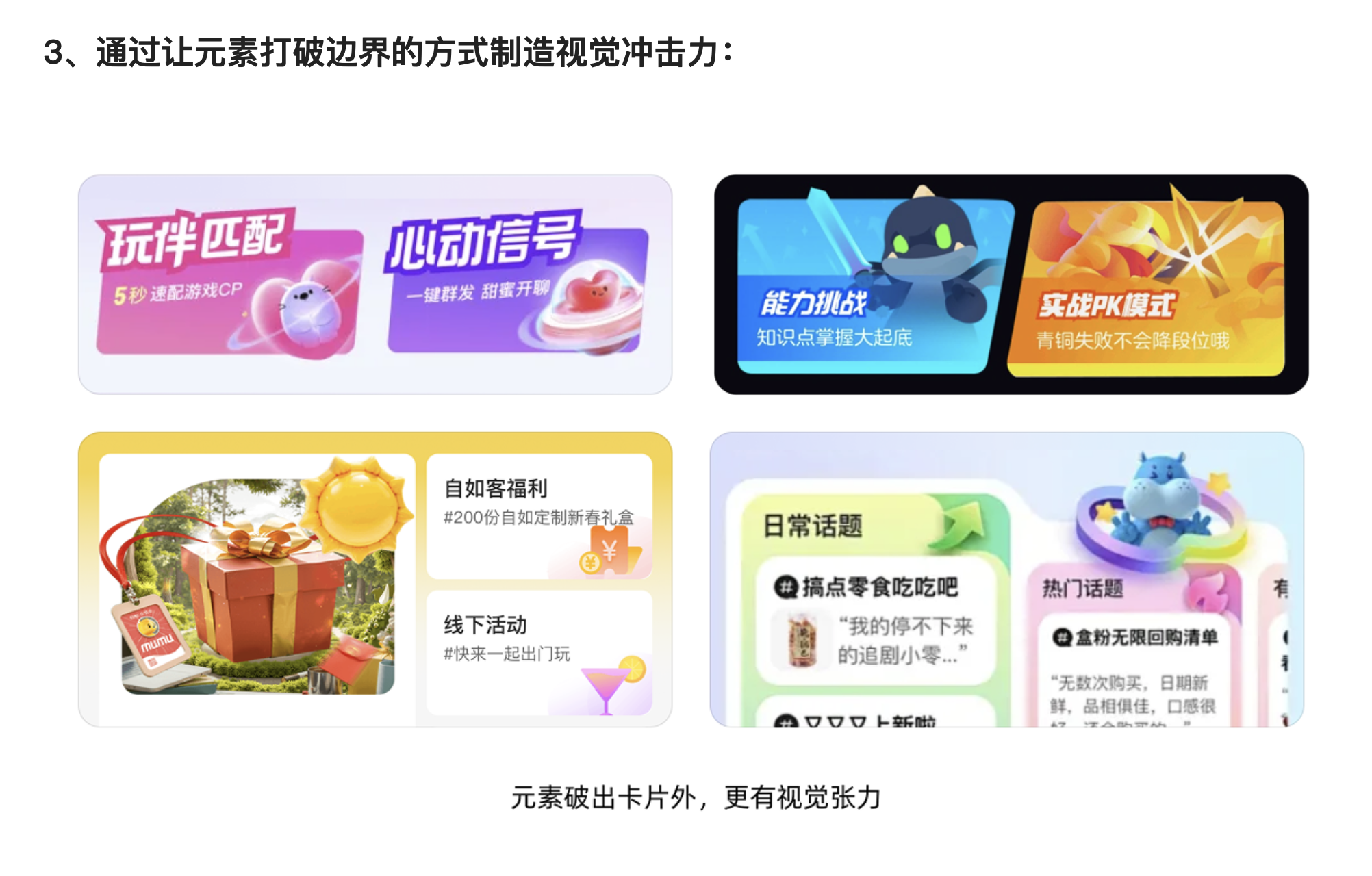 除了直接破型以外,我們還可以在卡片內部制造形狀,讓元素突破形狀,這樣不會打破整體的布局,也能營造視覺沖擊力: