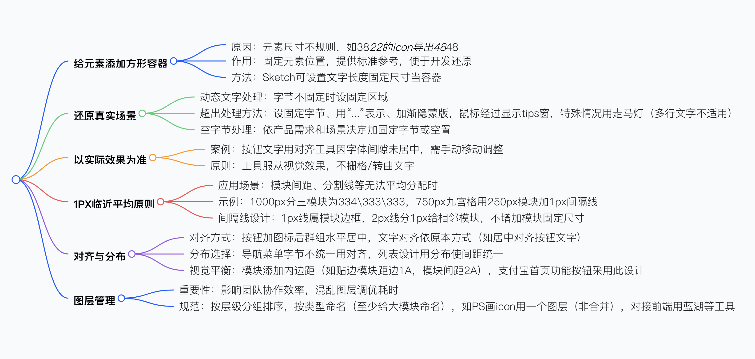 UI 設(shè)計(jì)需死摳細(xì)節(jié),包括給元素添加方形容器以固定位置方便開發(fā)還原,盡可能還原真實(shí)場景如處理動(dòng)態(tài)文字字節(jié)用省略號、漸隱蒙版或 tips 窗,以實(shí)際效果為準(zhǔn)調(diào)整文字對齊(如手動(dòng)移動(dòng)解決字體間隙問題),遵循 1PX 臨近平均原則處理無法均分的尺寸(如 334\333\333 的分配),注意對齊與分布(如導(dǎo)航菜單按需求選擇對齊或分布方式并添加內(nèi)邊距實(shí)現(xiàn)視覺平衡),以及做好圖層管理(按層級分組命名以提高協(xié)作效率),這些細(xì)節(jié)體現(xiàn)設(shè)計(jì)師專業(yè)素養(yǎng)并提升設(shè)計(jì)質(zhì)量。