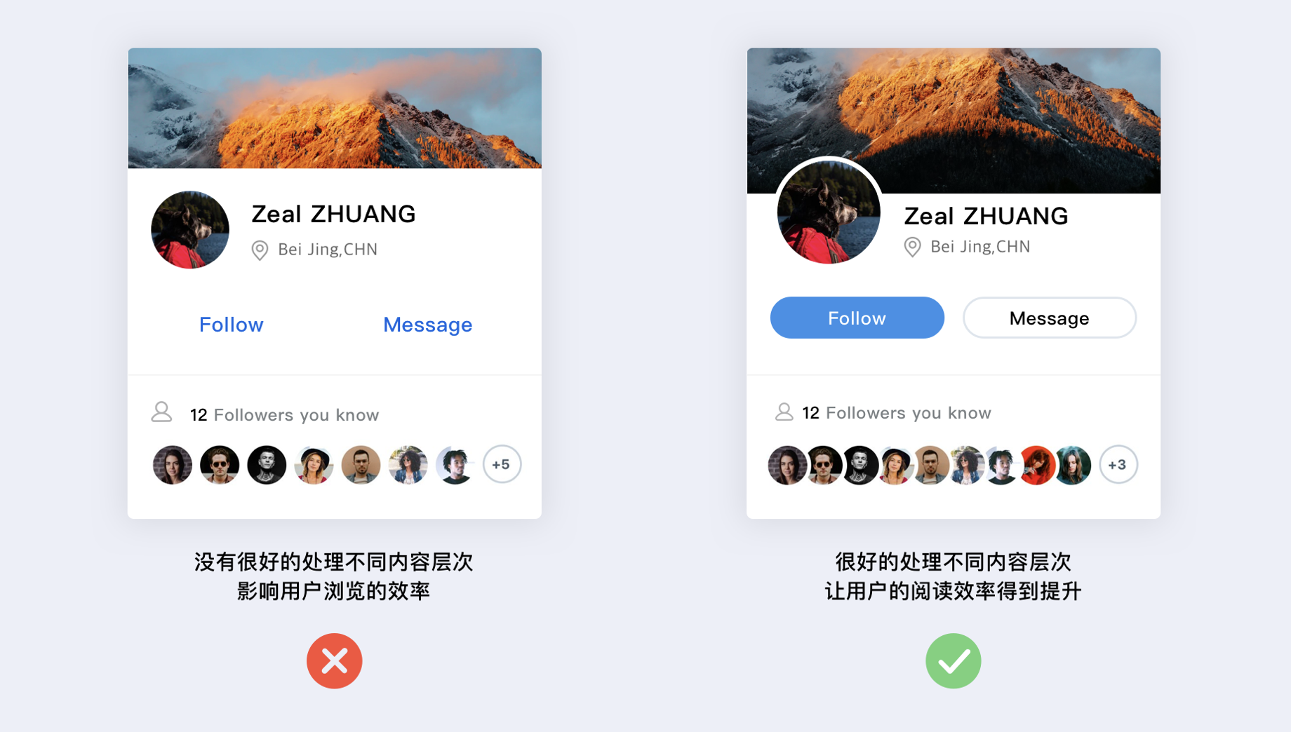- 模塊化分割:空間分割比線條分割給人更輕松的閱讀感受,如印象筆記老版本(線性分割)與新版本(卡片空間分割)對比。