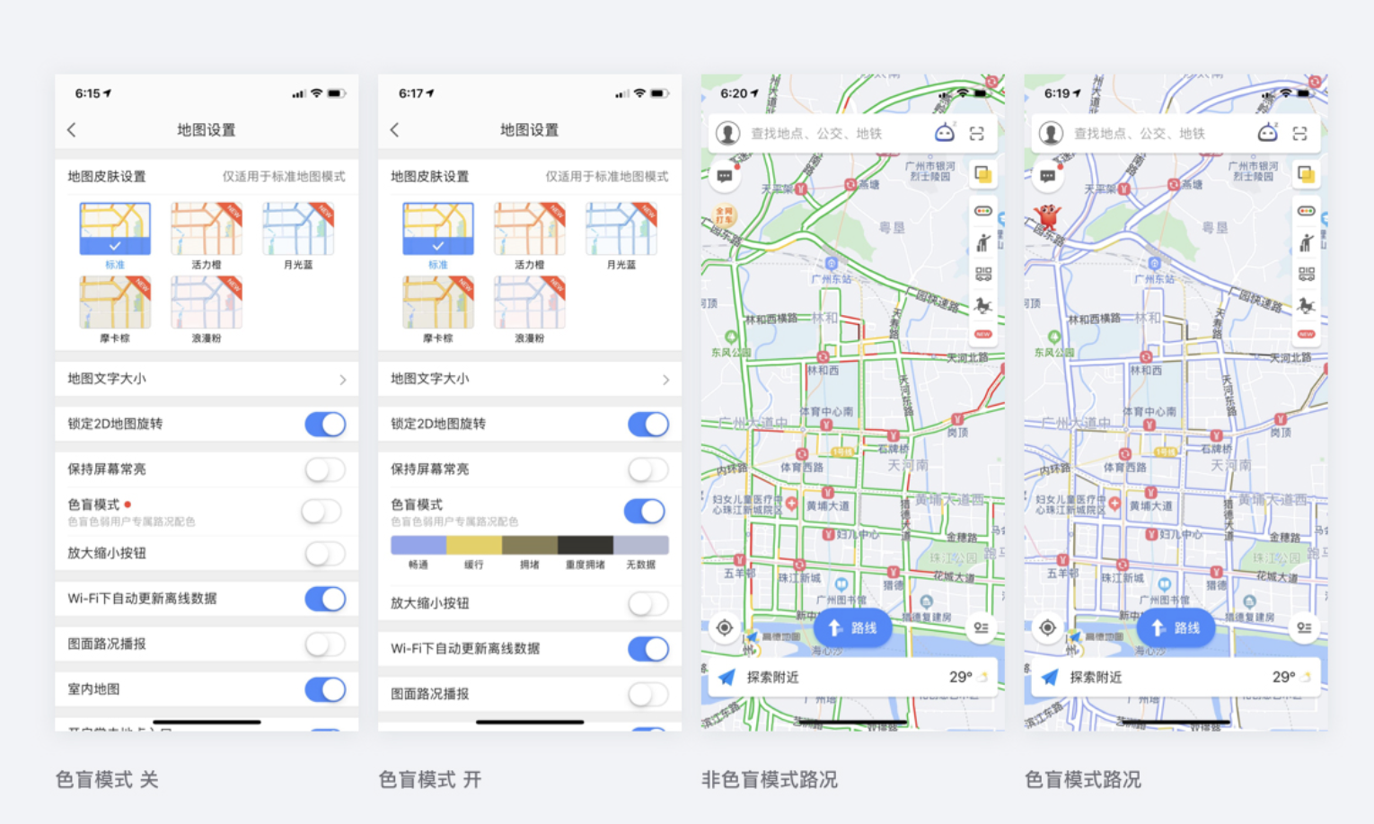 - 無障礙化的設計:重視服務特殊人群的設計,體現人文關懷和產品合理性、智能性,如高德地圖 APP 為色盲人群提供專屬路況信息顏色開關并可隨意編輯顏色。