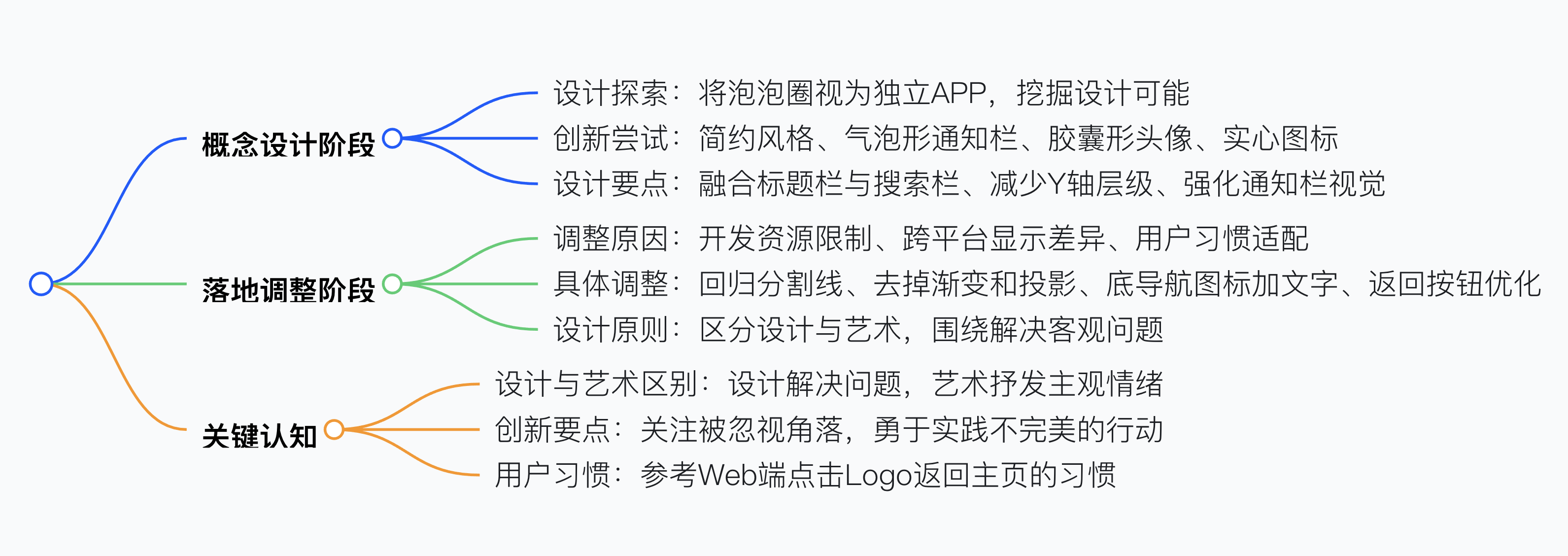 UI 設(shè)計(jì)思路應(yīng)先放飛概念探索多種可能,如將泡泡圈視為獨(dú)立 APP 進(jìn)行設(shè)計(jì),嘗試簡(jiǎn)約風(fēng)格、氣泡形通知欄、膠囊形頭像、實(shí)心圖標(biāo)等創(chuàng)新設(shè)計(jì),再結(jié)合實(shí)際落實(shí)到產(chǎn)品,比如因開(kāi)發(fā)資源和屏幕顯示限制去掉漸變和彌散投影、回歸分割線和返回按鈕,同時(shí)要明確設(shè)計(jì)與藝術(shù)的區(qū)別,設(shè)計(jì)需圍繞客觀問(wèn)題解決,概念稿后要提取可用點(diǎn)推動(dòng)落地,注重用戶習(xí)慣和跨平臺(tái)適配,像用愛(ài)奇藝 Logo 代替文字返回按鈕。
