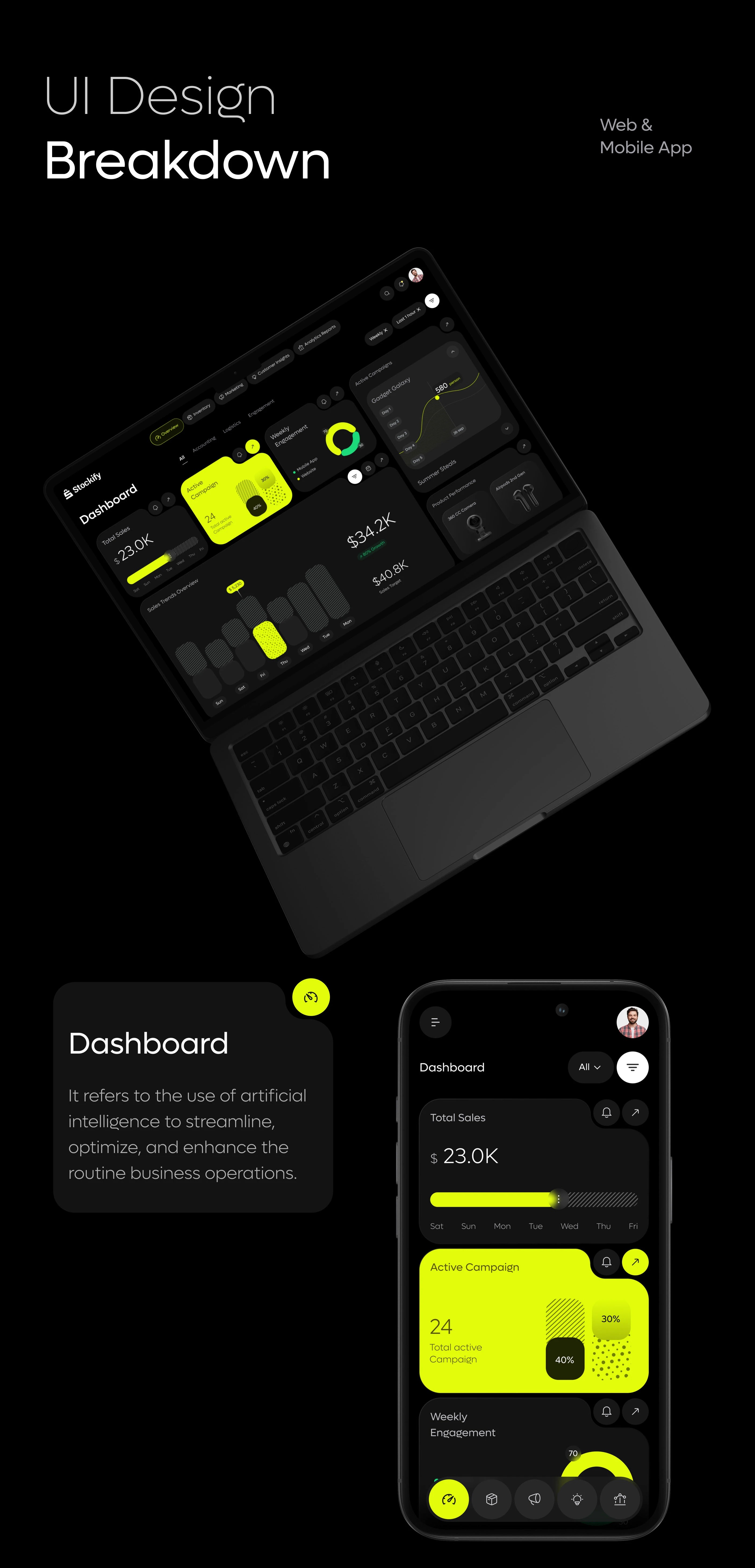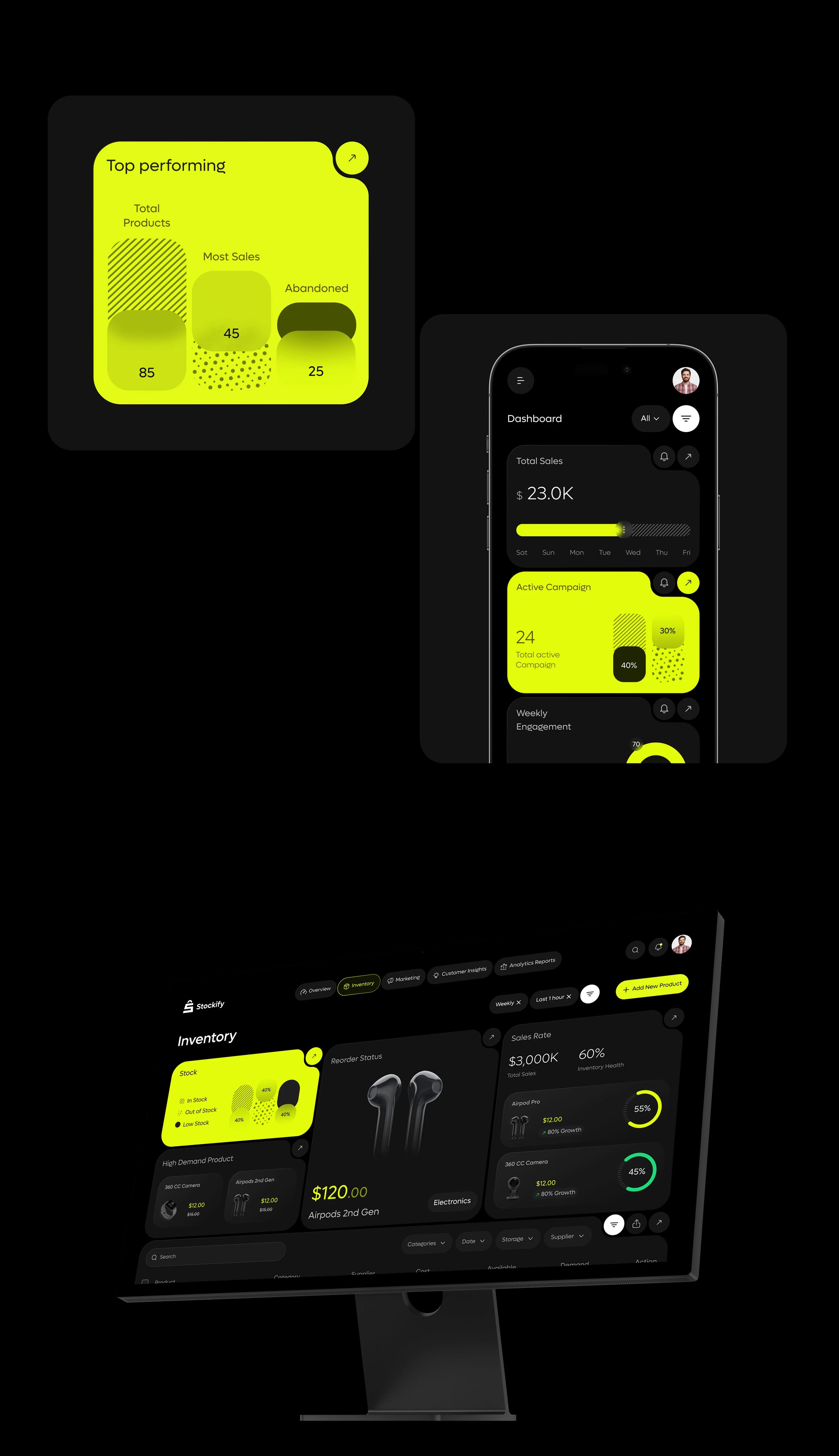 在信息密集的 B 端 SaaS 產品中,如何用清晰、節制而具有未來感的設計,提升用戶的效率和信任感?Stockify 的界面是一個值得研究的參考。一款聚焦 AI 推薦和智能庫存管理的電商 SaaS 工具。這類產品的設計挑戰在于 —— 如何讓用戶信任 AI 決策,并在復雜的信息中快速做出行動。它不是做“好看”的界面,而是通過界面傳達控制感與專業感。