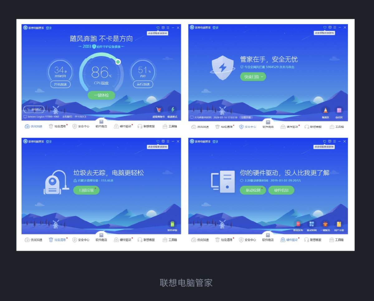 一致性設計能降低用戶學習成本、提升研發(fā)效率。布局一致性要保持統一結構,減少用戶對新結構的思考負擔。色彩一致性要求主色調統一傳遞品牌印象,功能性色彩形成固定規(guī)則。操作一致性是指同類功能操作邏輯統一,降低學習成本。反饋一致性要讓系統對同類操作的反饋方式統一,讓用戶與系統 “溝通順暢”。文字一致性要求文字大小、顏色、風格統一,避免用戶因 “格式混亂” 產生誤解。聲音一致性要使操作提示音固定,強化用戶對操作結果的預判。聯想電腦管家的優(yōu)化加速、垃圾清理等模塊,在布局、文字、反饋方式上保持一致,既提升了用戶體驗,也降低了研發(fā)成本。