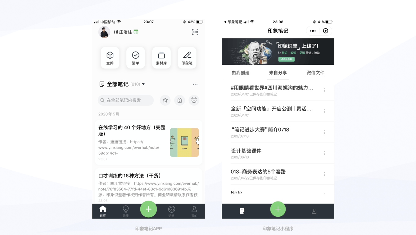 - 筆記類(lèi)(如印象筆記):突出 “由我創(chuàng)建”“來(lái)自分享”“微信文件” 三個(gè)核心入口,方便用戶通過(guò)微信快速收集分享筆記,還支持一鍵導(dǎo)入微信文件,避免文件過(guò)期;