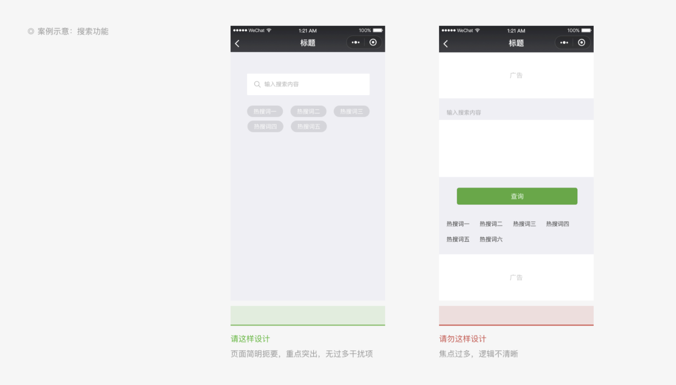 - 重點(diǎn)突出:頁(yè)面需簡(jiǎn)明,聚焦核心內(nèi)容,避免多焦點(diǎn)干擾。例如搜索功能應(yīng)減少無(wú)關(guān)熱搜詞,多按鈕設(shè)計(jì)需明確主次(如主操作按鈕突出,輔助操作弱化);
