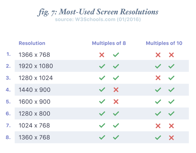 - 多平臺設計:不管外形如何,最流行的屏幕尺寸至少在一個軸上可以被 8 整除,通常是兩個軸。此外,一些平臺的樣式指南(如 Material Design)特別要求使用 4 或 8 點的網格,這使得該系統非常適用。