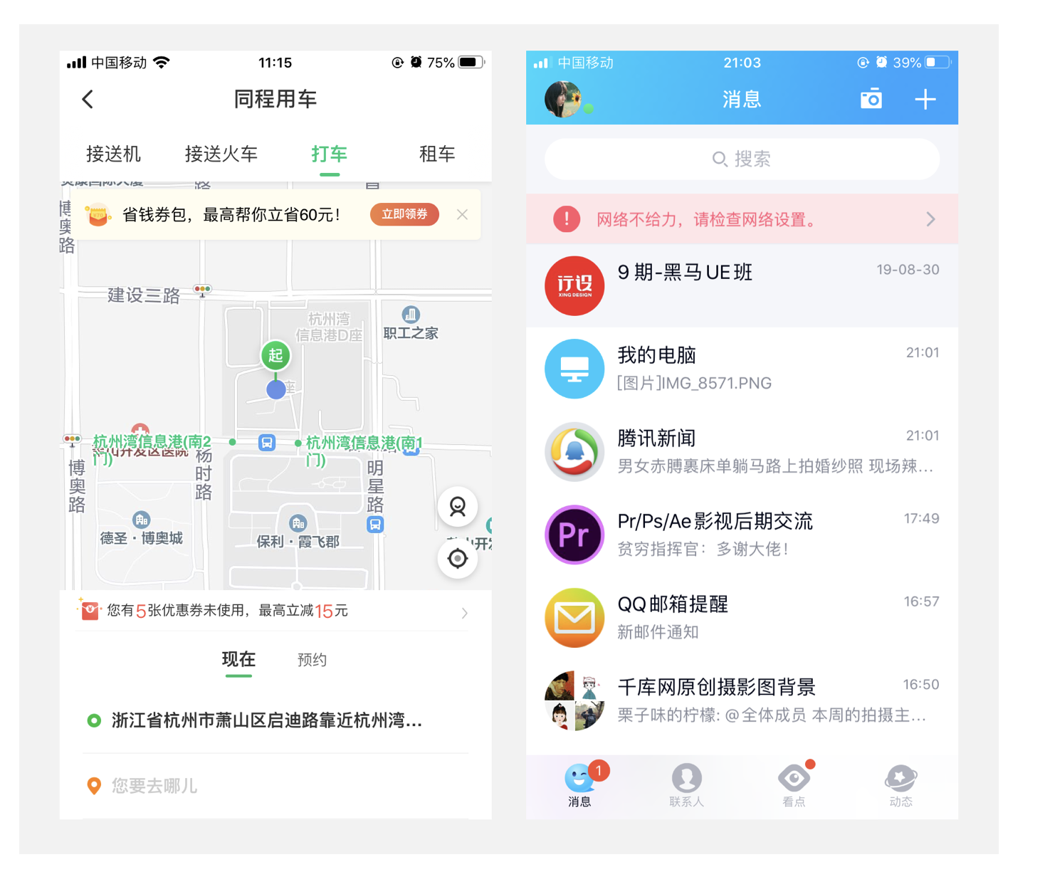 這是 Android 中的一個(gè)控件,會(huì)超時(shí)自動(dòng)關(guān)閉或者在屏幕上滑動(dòng)關(guān)閉,出現(xiàn)時(shí)間比 Toast 長(zhǎng),且可以點(diǎn)擊按鈕進(jìn)行交互。如京東的 Snackbar 提示用戶點(diǎn)擊箭頭查看喜歡的商品,為用戶推薦商品,并有關(guān)閉按鈕;酷狗音樂(lè)的 Snackbar 給用戶提供開(kāi)通會(huì)員的快捷入口,一直浮于頁(yè)面底部,沒(méi)有關(guān)閉按鈕;同程用車的領(lǐng)券活動(dòng)彈窗也屬于此類,是常用的營(yíng)銷手段;QQ 的斷網(wǎng)提示類似通知條樣式,會(huì)浮于頁(yè)面上方直到網(wǎng)絡(luò)恢復(fù)。