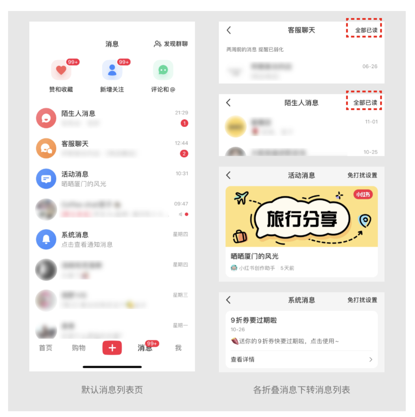 在所有 APP 里,小紅書的 “一鍵已讀” 最細膩 —— 它沒做 “全局一鍵清”,而是分場景設計,把 “該留的消息” 和 “該清的消息” 分得明明白白。