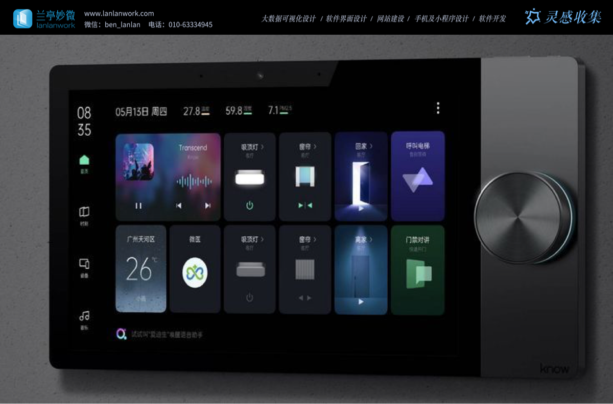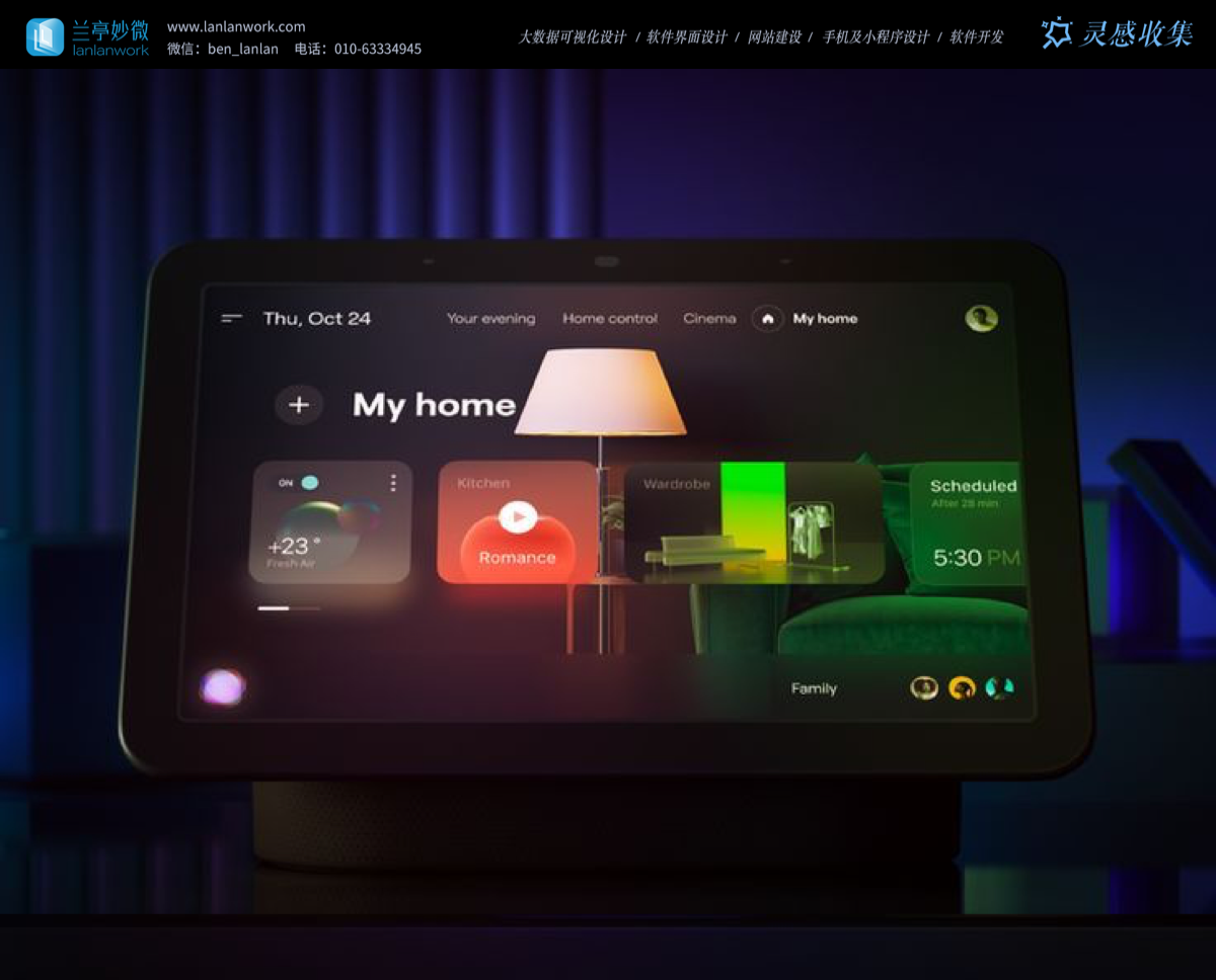 交互邏輯上,實現 “直覺化” 與 “場景化” 雙驅動。所有操作以按鈕、滑塊等直觀控件呈現,同時通過 “回家、影音” 等場景卡片,將功能控制升級為場景體驗,讓用戶從 “操作設備” 轉向 “享受生活”。且界面隨平板、墻面控制屏等終端形態調整,保持交互邏輯一致性,體現多端協同設計前瞻。