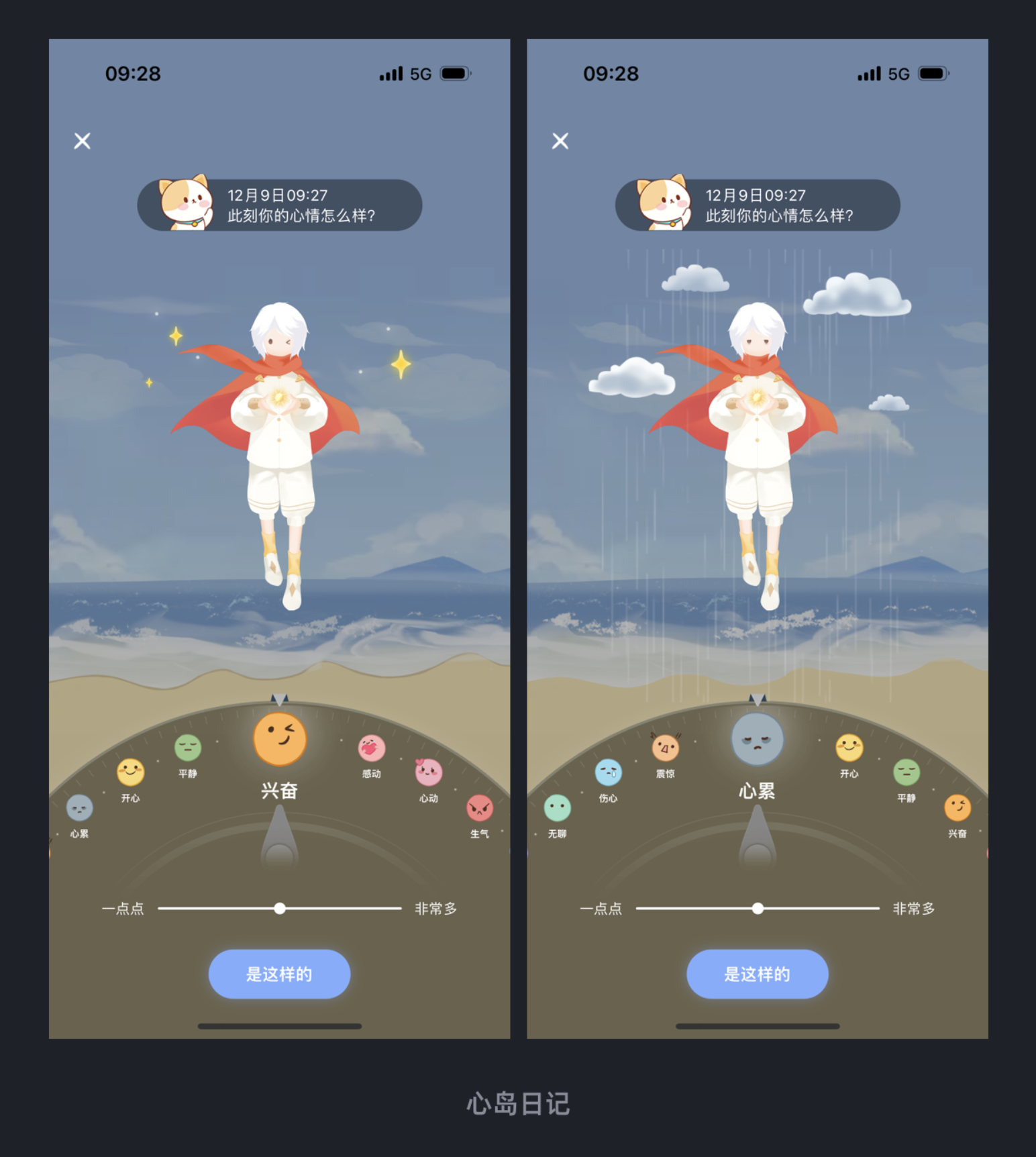 心情記錄類產品的核心是 “降低記錄門檻,強化情感共鳴”,心島日記的轉盤式心情記錄設計完美實現了這一點。用戶無需輸入文字,只需轉動轉盤,就能選擇 “開心”“平靜”“心累” 等心情狀態,還能通過 “一點點”“非常多” 的強度調節,精準傳遞當下感受。