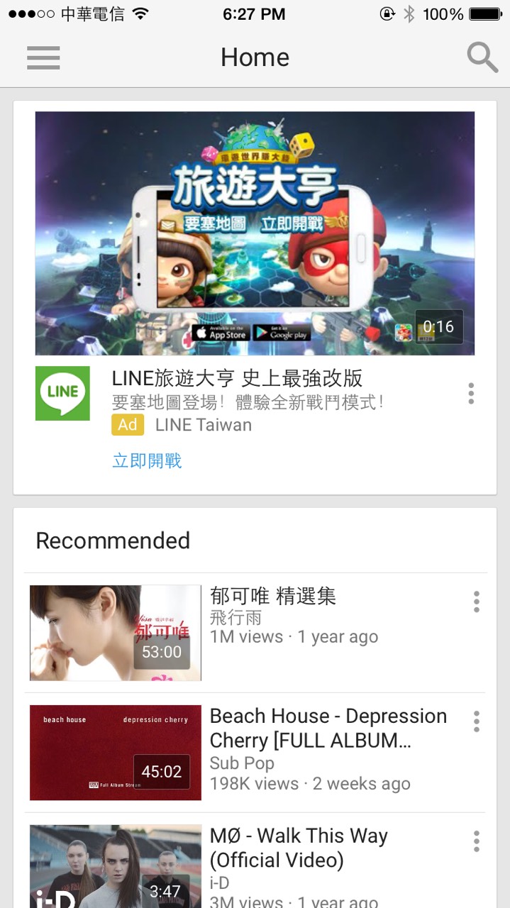 例如 YouTube 應用一點開,你就知道這個應用的基礎內容是什麼了。下面有推薦的內容,第一欄的 Home bar 則有明顯的查詢標識,讓用戶可以馬上開始查他想看的影片。