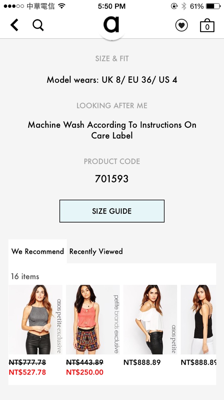 針對產品的呈現,有一個要訣就是讓使用者永遠可以快速地掃是產品描述、一眼看到重點資訊(如:尺碼、價格等等)。而最重要的「購買」鍵,更應該不管使用者到哪裡,它都要夠醒目;另外,也應該附上「放入愿望清單」的選項,供用戶可以管理他想要購買的內容;因為很多用戶都是利用通勤等零碎時間使用應用,通常這些時間并不夠支撐用戶完成一個購物的流程,所以有欲望清單讓他可以先選好放著,是一個較佳的設計。