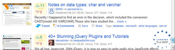 與分頁相反,連續滾動是一種新型的數據顯示方式。這種方式不需要選擇特定的數據類型,新的數據被加到列表里。在加載的時候顯示進度,如下例所示,在dzone.com里,進度條顯示有多少項已經被加載。