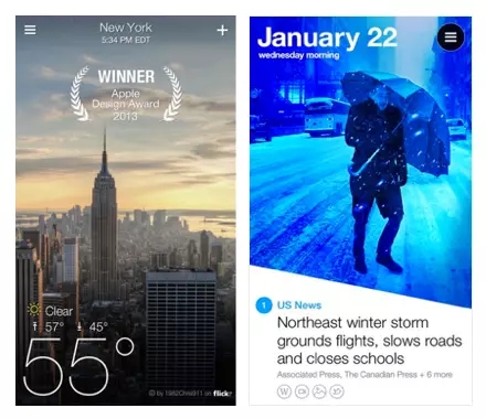 例如以設(shè)計精美著稱的Yahoo的兩款明星App產(chǎn)品Yahoo Weather!和Yahoo Digest。除了在產(chǎn)品設(shè)計上的和突出表現(xiàn)外,模糊和斜切的手法,給整個產(chǎn)品的品牌氣質(zhì)提升到了一個新的高度。 Yahoo Weather! 不論是在布局、字體和色彩的運用上都顯得精致細膩,滑動時高斯模糊的處理更是流暢平滑。Yahoo Digest 的斜切突出一個“破”,在不影響照片內(nèi)容的前提下,既能在視覺上顯得與眾不同,又在排版上巧妙地為色彩標(biāo)簽留了一角之地。比起一刀平,更顯靈動而不失平衡感。