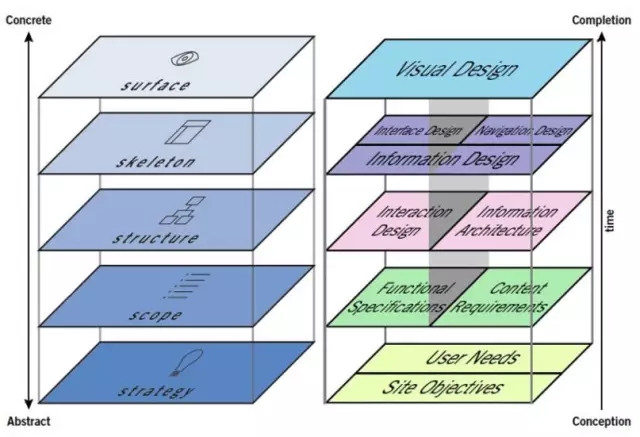 想了解 UI/UX,就一定要了解這張圖,這是 Jesse James Garrett 在2000年發表的用戶經驗元素一書中所提出:使用者的經驗可分成抽象到具體,也就是由策略、范圍、結構、骨架、表層所構成。