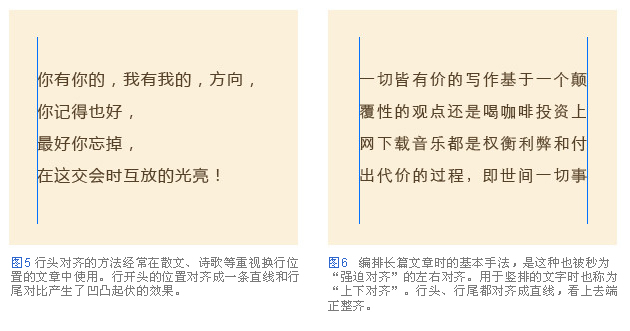 排版中重要的一條,是把應(yīng)該對齊的部分對齊,例如每一個段落的字行對齊,就是把行的位置進行對齊使其一致的方法。行頭對齊是所有行均在行頭對齊的方法(圖5)雖說這種用法使得行尾不齊整,但方便文章的停頓部分換行,適用于散文、詩歌等表現(xiàn)韻味的文字版式。但是,對于編排長篇文章時,選擇左右對齊更能體現(xiàn)條理性。由于換行的位置都相同,閱讀行頭或換行的時候視線能夠平緩流暢地移動。
