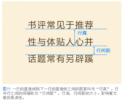 行高,行間距的大小對文章的易讀性有很大的影響。行與行之間拉得過開,從一行末尾移動到下一行開頭,視線的移動距離過長增加了閱讀難度。相反,行與行之間貼得過緊,上下挨得過緊影響了視線的移動,讓人不知道正在閱讀哪一行(圖12)。正文最恰當(dāng)?shù)男懈?,基本?yīng)該設(shè)定為其文章中文字大小的兩倍。例如文字大小為8px的文章,就應(yīng)該把行高設(shè)定為16px(圖13)