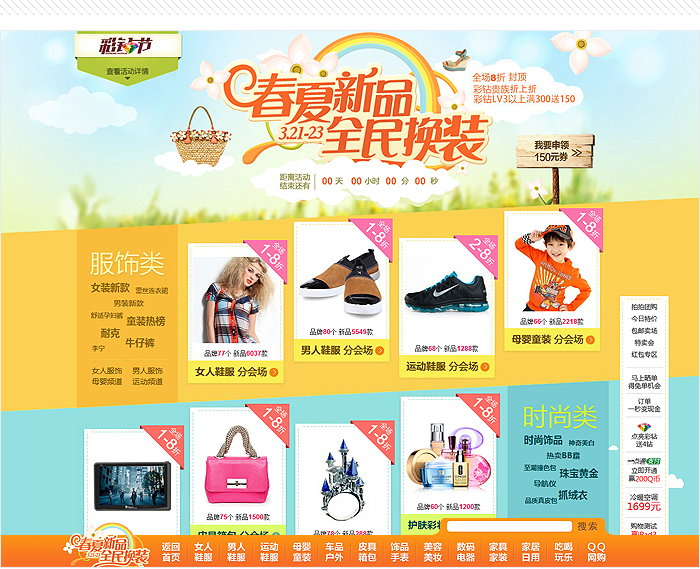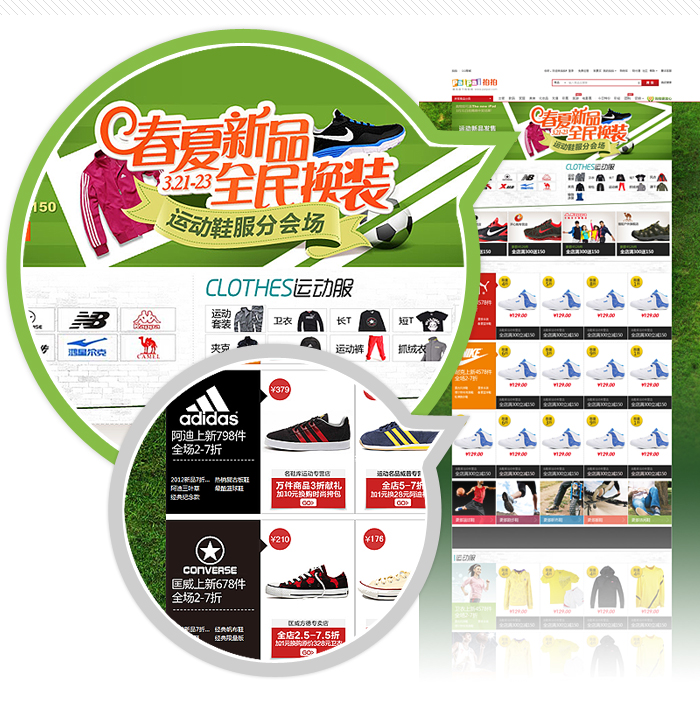 拍拍3月的大型促銷活動(dòng)《春夏新品,全民換裝》,主會(huì)場(chǎng)設(shè)計(jì)上運(yùn)用明快、鮮艷的春夏色彩塊組合,在細(xì)節(jié)上采用花朵草地藍(lán)天更加突顯初春購(gòu)物的輕松氛圍。并在活動(dòng)頭部主畫面中采用HTML5+CSS3實(shí)現(xiàn)的酷炫動(dòng)畫,為用戶帶來(lái)了全新的頁(yè)面體驗(yàn)。