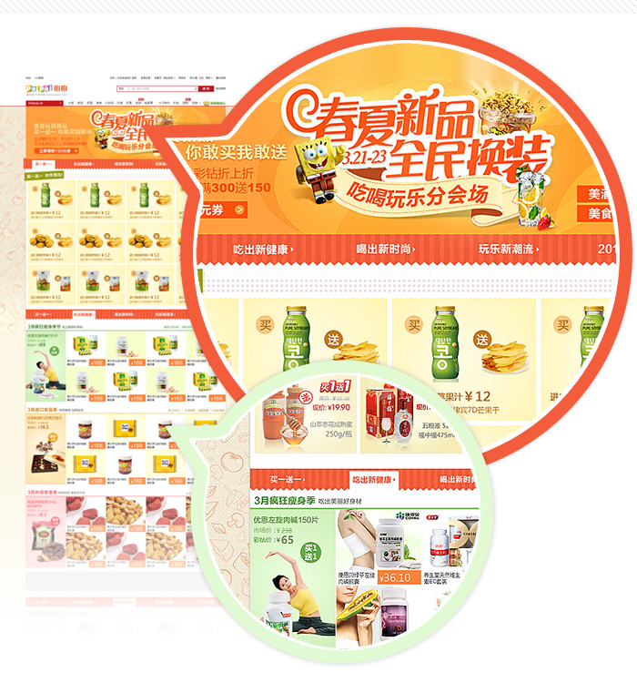 3月促食品分會(huì)場(chǎng)運(yùn)用鮮明的色彩,大背景采用不同食品線稿大小不一、層次分明的組合,渲染出美食熱鬧的氛圍,從而提高消費(fèi)者的購(gòu)買欲望
