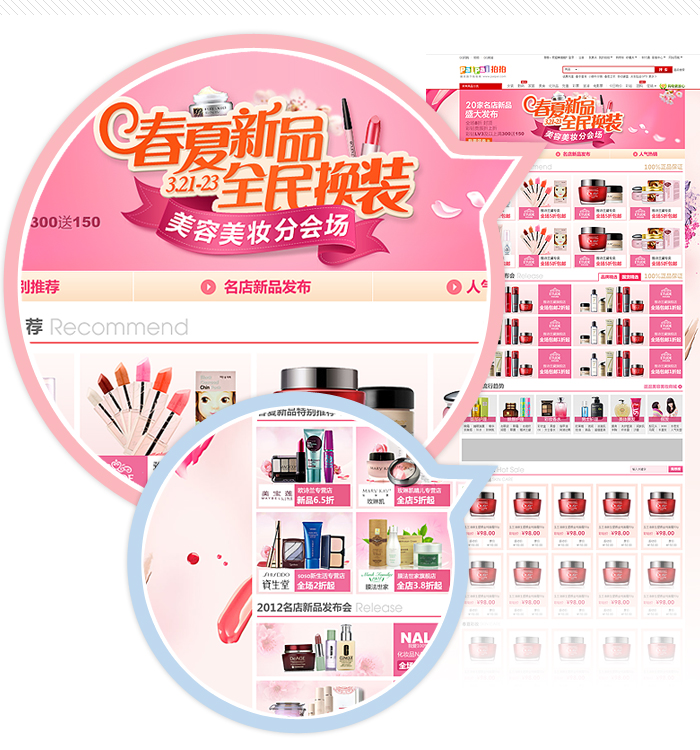 3月促化妝品分會(huì)場(chǎng)運(yùn)用粉紅色為主色調(diào),更容易讓人聯(lián)想到粉嫩的肌膚和絢麗的彩妝。大背景使用護(hù)膚品和彩妝用品的特寫展現(xiàn)美容用品的美感,烘托賣場(chǎng)氛圍。
