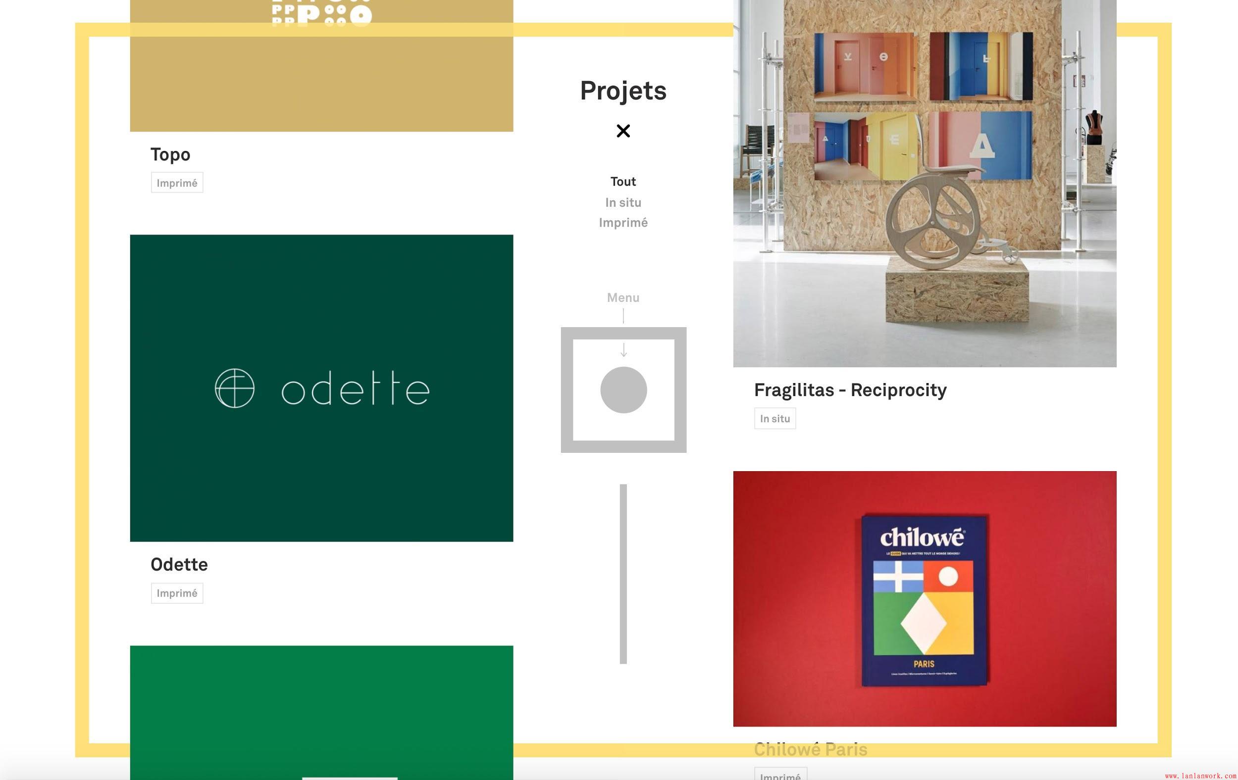Signes du Quotidien網站打破傳統的網頁布局,以微妙的方式使用基本的方形和圓形,呈現獨特的視覺層次結構,引導訪問者瀏覽內容。菜單位于頁面的中心,當訪問者點擊它時,會出現代表網站四個部分的四個彩色圓點。訪客然后將其中一個點拖入正方形以轉到該部分。