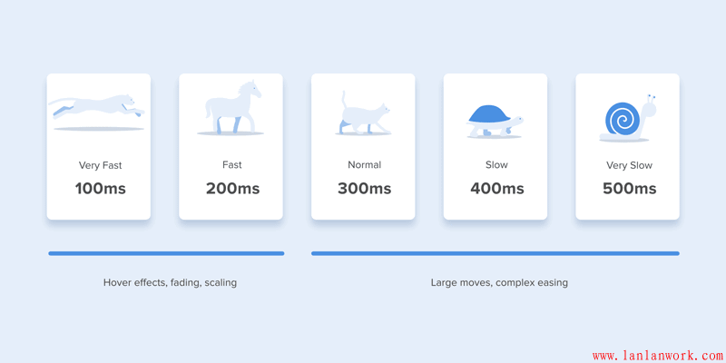 大量的研究發現在界面中最優的時間是200-500ms。這個數字是根據人類大腦的認知水平得出來的。任何小于100ms的動畫是人類很難感知到的,而其他大于1秒的動畫又會讓用戶覺得有些延遲,不夠流暢。
