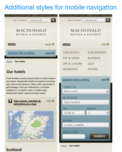 對于手機用戶來說,有一個問題:多數頁面在首屏中只能顯示網站名、全局導航和搜索等功能;用戶點擊全局導航中的鏈接之后,即使頁面正常的進行了跳轉,也會給人一種錯覺,好像頁面并沒有發生變化;除非滾動頁面,通過查看頁面的主要內容部分,來判斷當前是否處于自己的目標頁面。一個常見的解決方法是,對于小屏幕設備,將全局導航與主要內容之間的部分設計為可以展開或收起的容器,默認狀態為收起,這樣即能使主要內容可以呈現在首屏中,也可以保證功能的可用性。