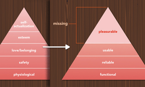 “情感化設計(Emotional Design)”一詞由Donald Norman在其同名著作 當中提出。而在Designing for Emotion 一書中,作者Aarron Walter將情感化設計與馬斯洛的人類需求層次理論聯系了起來。正如人類的生理、安全、愛與歸屬、自尊和自我實現這五個層次的需求,產品特質也可以被劃分為功能性、可依賴性、可用性和愉悅性這四個從低到高的層面,而情感化設計則處于其中最上層的“愉悅性”層面當中。